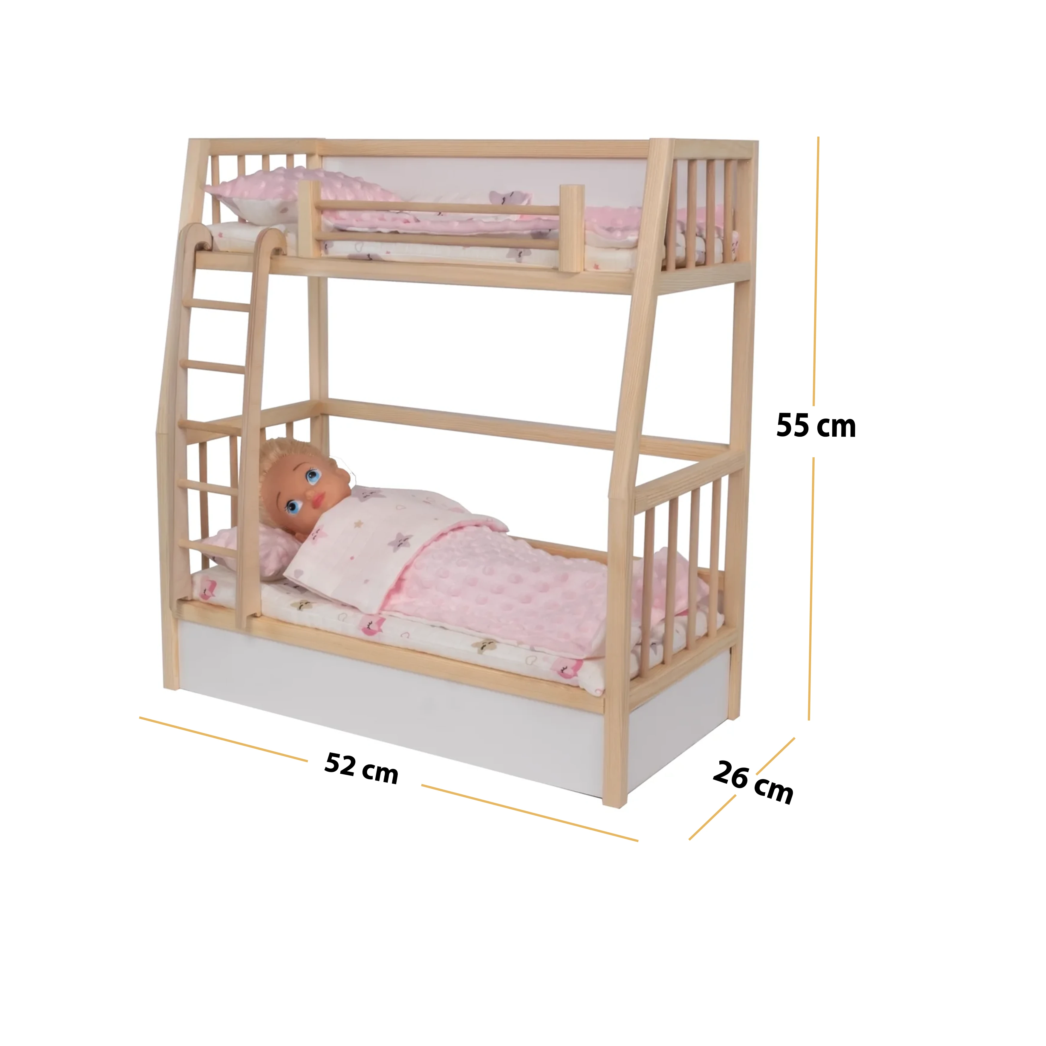 Ahşap oyuncak ranza, bebek yatak odası seti, mini ahşap ranza, oyuncak mobilya seti, yerli üretim oyuncak, 46 cm bebek ranza, doğal ahşap oyuncak, çocuk odası aksesuarı, demonte oyuncak mobilya, eğitici oyun seti